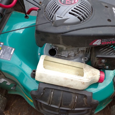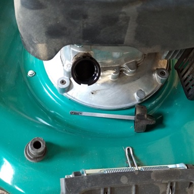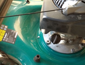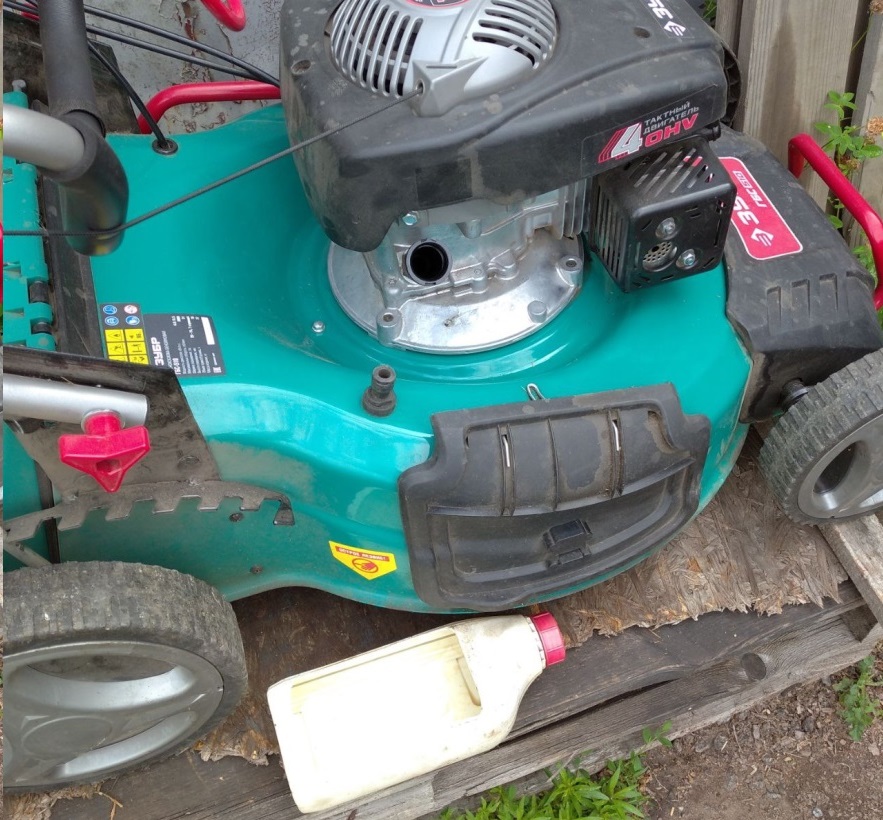 При такой замене масла, когда мы наклоняем газонокосилку, чтобы слить отработанное масло, часть масла через выпускной клапан попадает в глушитель. И когда мы заведем косилку она начнет сильно дымить. Чтобы такого не случилось, надо перед тем как сливать масло закрыть клапана. Взять за ручку стартера и протянуть шнур до усилия. Это будет ВМТ и клапана будут закрыты. Или можно использовать шприц для откачки масла.